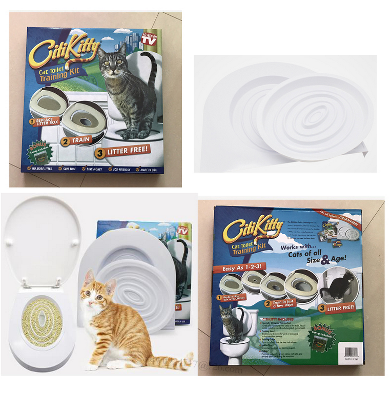 Modo de uso: colocar el baño entrenador de gato en el inodoro, colocar arena y recortar el círculo más pequeño, con el pasar de los días ir retirando el resto de círculos hasta que el gato esté completamente acostumbrado.
