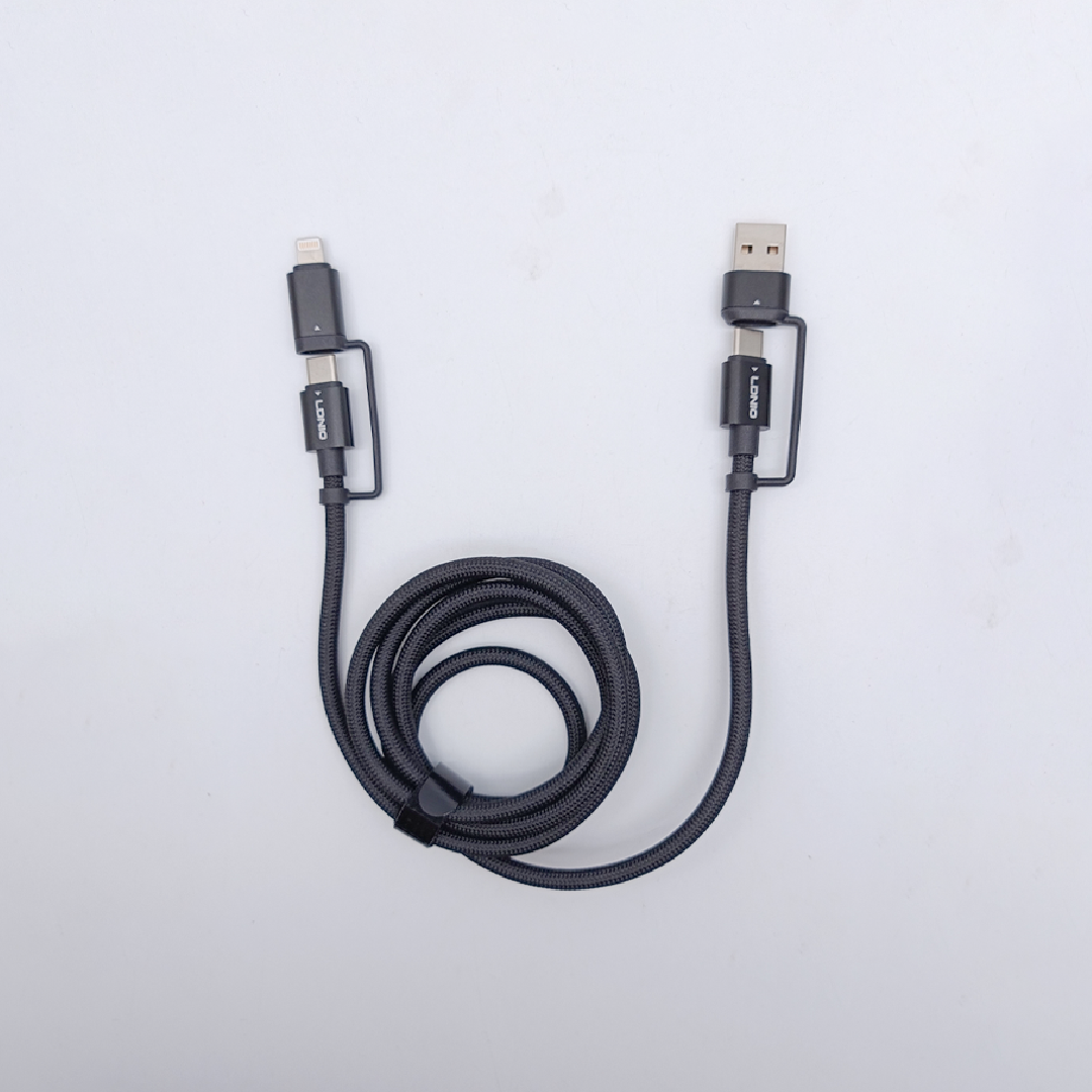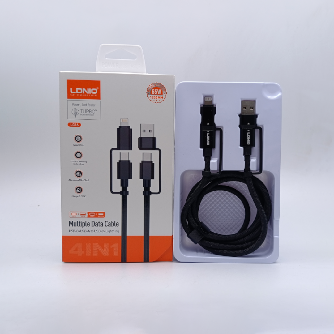 LDNIO LC16 es el cable que necesitas 4 en 1 que reúne versatilidad, velocidad y resistencia en un solo accesorio. Con conectores USB-C, USB-A, Lightning y Micro USB, permite cargar y transferir datos de múltiples dispositivos a la vez con potencia de hasta 65W. Incorpora chip inteligente para proteger tus equipos, un cable trenzado PET+PP ultrarresistente y carcasa de aleación de aluminio que soporta el uso diario sin daños. Con 1.2 metros de longitud, es la solución todo en uno para tener energía confiable donde la necesites.