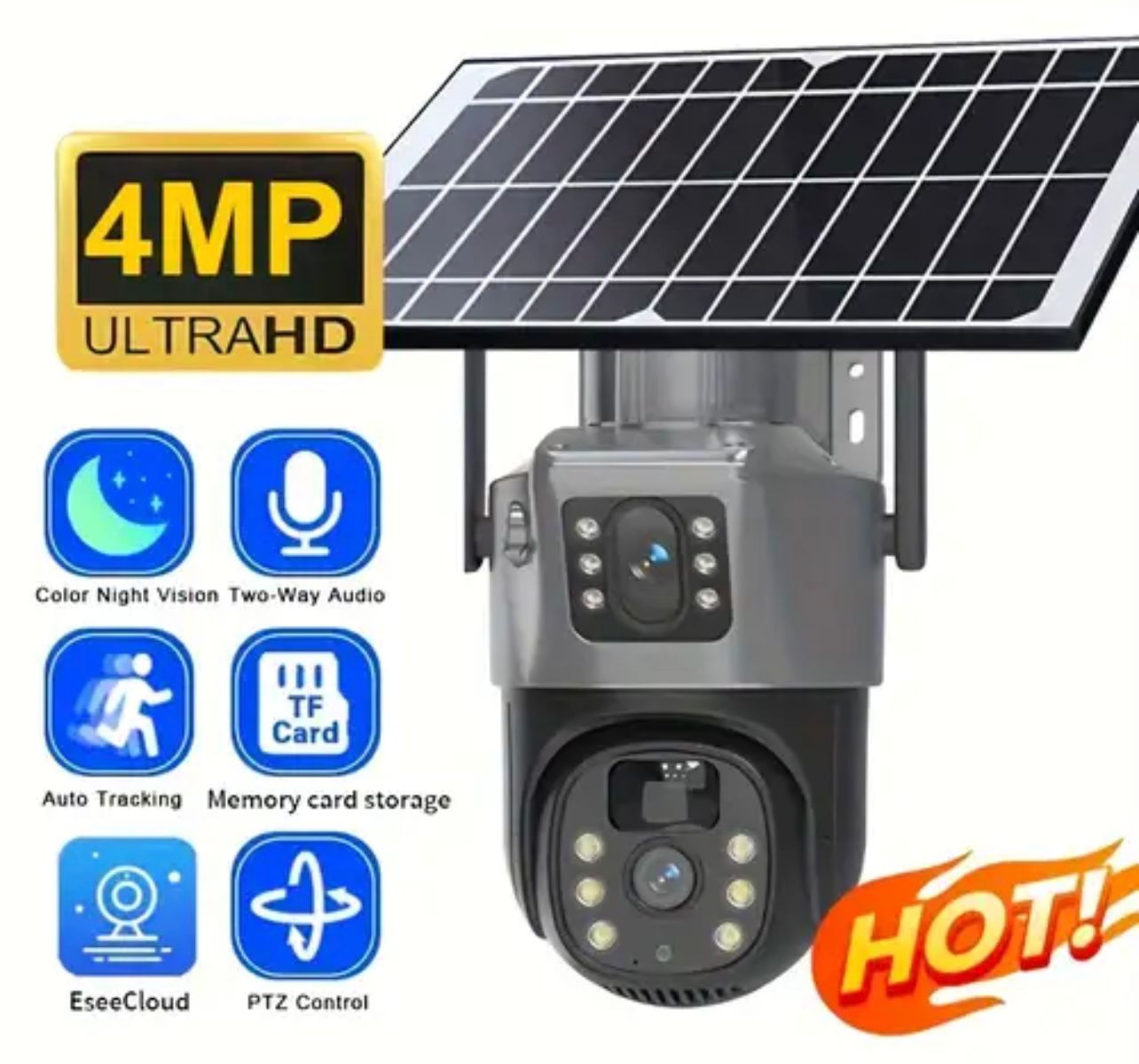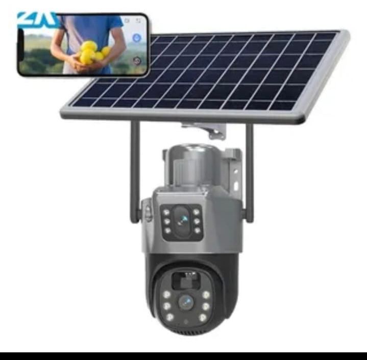 Cámara de seguridad inalámbrica para exteriores con un panel solar que proporciona energía continua. Su funcionalidad PTZ permite el control remoto del movimiento de la cámara para cubrir un amplio campo de visión. Gracias a su visión nocturna y conexión Wi-Fi, puedes monitorear tu propiedad en tiempo real desde tu teléfono, en cualquier momento y lugar. Su diseño resistente a la intemperie la hace ideal para uso en exteriores.