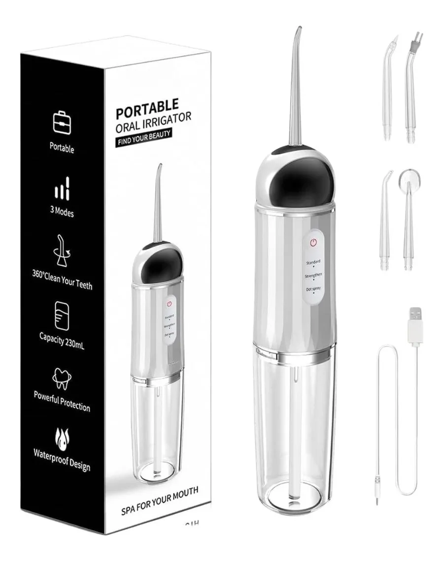 El irrigador dental portátil recargable es la herramienta ideal para quienes buscan mejorar su higiene bucal de manera efectiva y cómoda. Su diseño elegante en color plateado no solo le da un toque moderno, sino que también es funcional y práctico para usar en casa o llevar de viaje. Este dispositivo cuenta con la capacidad de 200 mL, permitiendo una limpieza profunda y efectiva en cada uso.