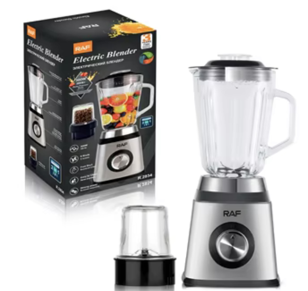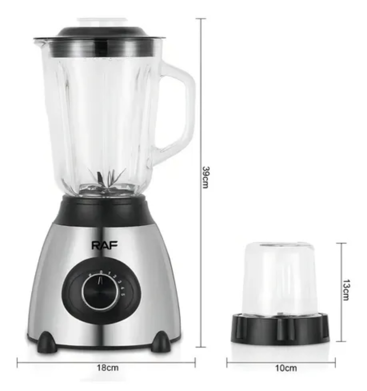 Determinar las dimensiones exactas de la licuadora RAF R.92834 basándome únicamente en la foto es muy difícil, ya que no hay una referencia de escala. La caja indica algunas especificaciones, pero no las medidas físicas del producto.