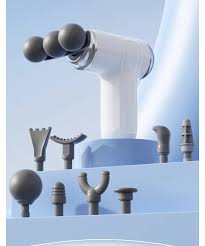 Descripción del producto: Es una pistola de masaje de tamaño pequeño, inalámbrica, con un diseño ergonómico y varios cabezales intercambiables para masajear diferentes grupos musculares como la espalda, los brazos, las piernas, los hombros y el cuello.